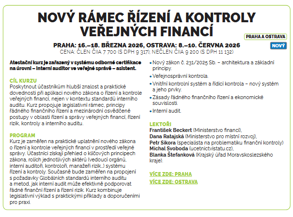 Přihláška a informace pořadatele - Českého institutu interních auditorů (ČIIA) o programu: www.interniaudit.cz/novy-ramec-rizeni-a-kontroly-verejnych-financi-vs189
